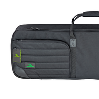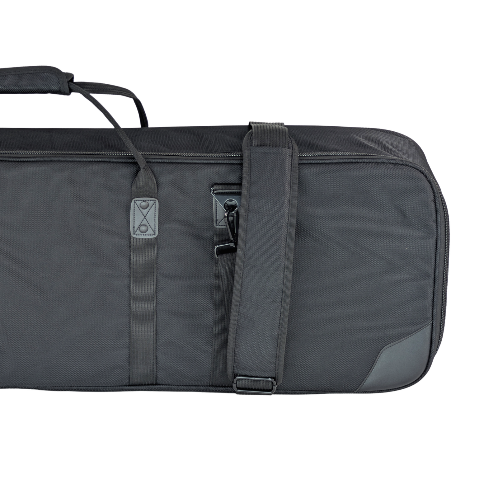 A generously sized zippered front pocket stores cables, accessories, and sheet music. The adjustable padded shoulder strap provides comfortable, ergonomic transport, complemented by a reinforced carry handle for an alternative secure grip.